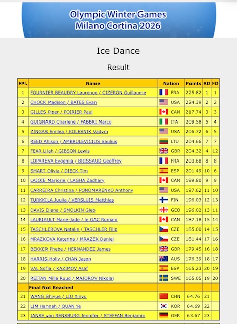I had a feeling it would go down this way, unfortunately. But Chock and Bates can be proud of all they've accomplished. I expect we'll get an announcement that they will be retiring after Olympics unless they decide to compete at Worlds. Happy that Piper and Paul won the Bronze.