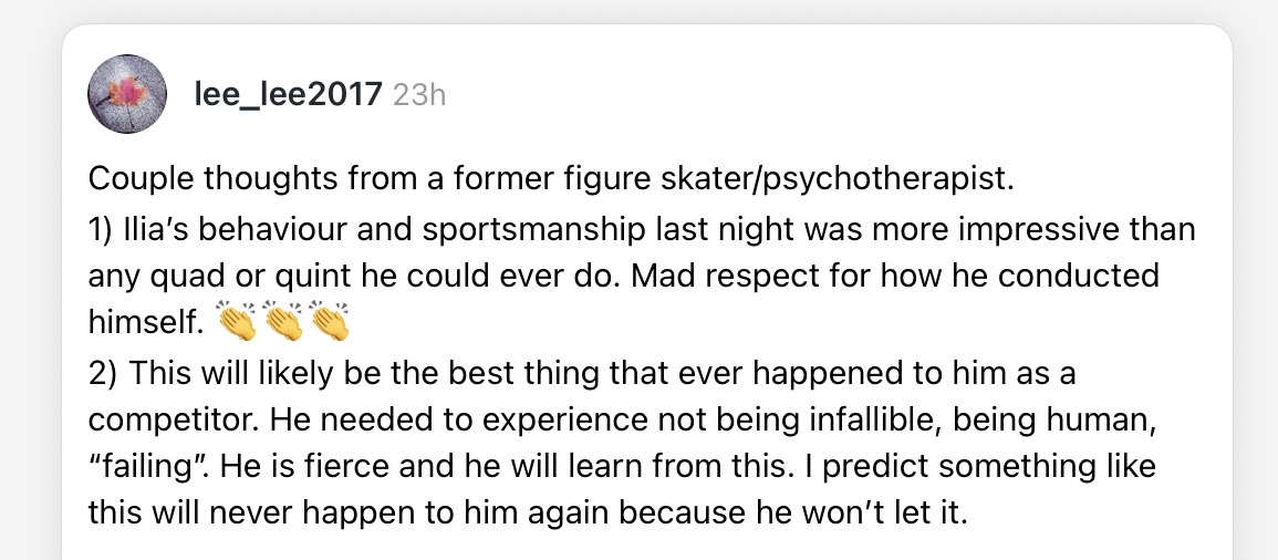 I still can’t believe he went for that quad axel. He was winning everything without it. I read he had a very good warm up so I’m guessing the fall on that quad axel must’ve thrown him off. I wonder what his father thought about that decision. Someone said he didn’t appear to comfort Ilia afterwards. I also heard that immediately after his skate, Ilia told his father that they should’ve sent him to the Beijing Olympics. I remember there was a lot of talk back then that the U.S made a big mistake in not sending him so that he could get some experience under his belt for the next Olympics.