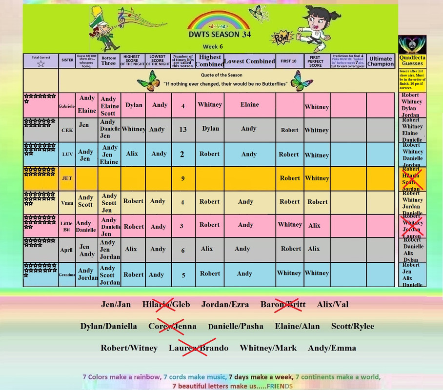 ETA............Gabriele, I added one pt from tonights show as that is the most anyone could get. lol  I just need how many you got right last week.  Take care